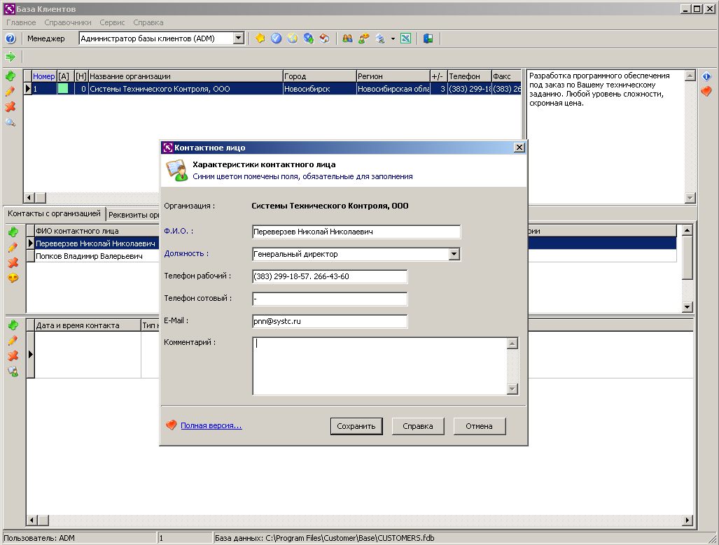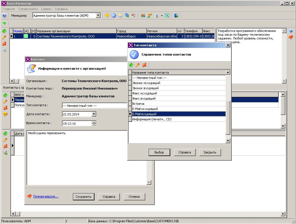 Безплатная, сетевая программа, мини-CRM «База Клиентов 2.0» для небольших организаций. Позволяет нескольким менеджерам работать по сети с единой базой клиентов организации. База данных имеет формат Firebird 2.0 - поэтому, для того, чтобы программа имела возможность работать со своим файлом базы данных, необходимо установить сервер Firebird версии 2.0 (скачать его можно ниже). ВНИМАНИЕ: Не устанавливайте Firebird более новых версий, нежели 2.0.
