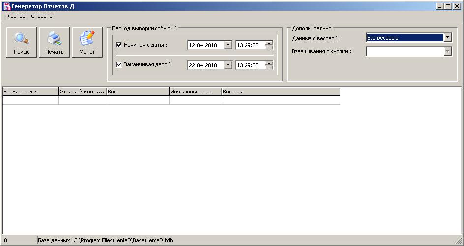 Программный комплекс «LentaD» («Лента - Д») версии 1.0 служит для приема веса с конвейерных весов, отображения этого веса на внешнем табло и запись этого веса в базу данных по нажатию одной из двух кнопок, ответственных за взвешивание двух видов автомобилей (грузовиков HOWO и КамАЗ). Комплекс позволяет работать с единой базой данных нескольким программам «Регистратор Событий», объединяя таким образом, информацию с нескольких конвейеров. Для поиска нужных взвешиваний в базе данных и их последующей печати, предназначена программа «Генератор Отчетов», которая может присоединяться к базе данных с сетевого компьютера. Файл базы данных, для надежности, может периодически архивироваться в автоматическом режиме с помощью программы «Архиватор комплекса LentaD 1.0».